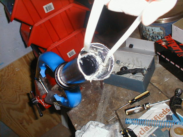 - Remember from the Super Fatty M overview I said: "keep the same races in the same position and orientation" -well, we're now at that bit where we need to secure the races so they all don't fall apart once we take the fork apart. One important thing here to help ensure everything goes back together exactly the same way -make sure you know which way the steerer tube goes on the fork steerer tube -this can be done by looking to see where the single vent hole goes in relation to the fork. The vent hole is a small hole that allows the air to escape from the suspension assembly. I secured my bottom inner races by simply tightly wrapping electrical tape around them. I also tried to use permanent marker to number the races and positions, but found that I could not get the races clean enough even for the permanent marker to take. I read you could use nail varnish to mark the numbers, but it wasn't my day to do my nails or get a perm, and hence did not have access to it. OK, with the lower inner races secured, we now need to secure the top outer races on the outer steerer tube. This is done by basically blowing up part of an inner tube inside the steerer tube, forcing the races to remain in place. It's really, really easy, and better still, works!!!!! Well, sort of.... read on for a cautionary tale: I was really excited at this point. I'd read about using the piece of inner tube to secure the outer races (brilliant I thought, ingeniously simple), and was well versed in how important it was to keep the races in their original positions and orientations. I found an old inner tube I had (700x23) which I decided was to be my sacrifice to the Cannondale Gods, and cut it about 5 cm up from the valve. Next, I cut past the valve about 25 cm down. Feverishly and with great anticipation I zip tied both ends and test inflated it. Perfect! It looked like a dull fat Lancashire black pudding (sorry, reference here for northern English folk) about 25cm long . Feeling well chuffed with myself for being so fortunate to read about such a clever tip, I deflated it -and hurriedly put it into the top of the steerer tube about 10cm down and re-inflated. I was worried about the races moving, so I pumped it up quite well to make extra sure the fit was a snug one. Sounds good eh?
