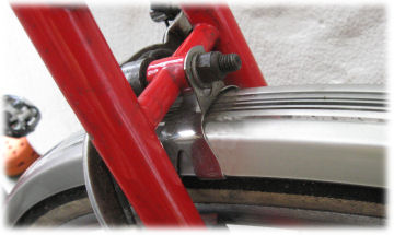The Planet Bike fender clips, at the fender end of the stays, also serve as a safety release, but they tend to loosen over time, so they eventually come apart during rides. Gluing them together with hot-melt or epoxy glue will cure this problem. The safety feature isn't impaired much, because a strong pull can still slide the stays out of their screw-on fittings. Once you have glued the clips together, removing the fenders requires unscrewing the fittings, or removing the bolts near the dropouts.