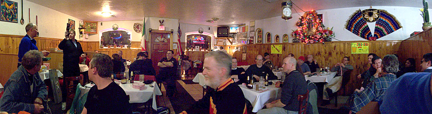 Tom Deakins was kind enough to drive me over to this annual get-together of the local bike industry. I'm so glad it's back at the Taqueria in Waltham, one of my favorite eateries. It was good to get a ride, because the parking lot is up a fairly steep driveway that I don't think I could have handled on foot without falling down.Tom was also kind enough to drop off and install my new exercise machine, a "Spinning" type fixed-gear unit.