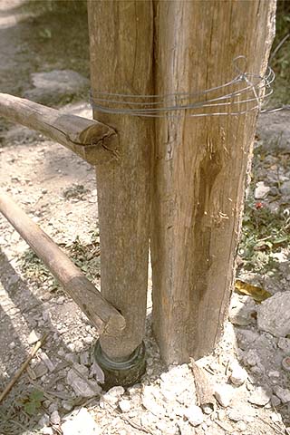 This is a glorious example of third-world technology at its best. The Coba site is in the deep jungle, far from hardware stores. An ingenious local artizan was able to fashion a quite serviceable hinge for a heavy gate, using a discarded champagne bottle from the nearby Club Med hotel for the load-bearing lower hinge. The bottle has been buried in the ground upside down, and the sharpened vertical post of the gate rotates nicely in the punt.