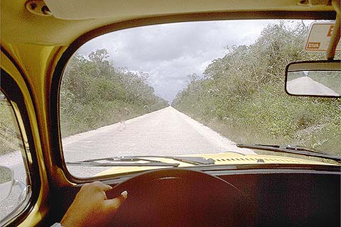 The road from Tulum to Coba is an unrelieved 50 km straight shot through the jungle. We had it to ourselves when we were there, in our rented made-in-Mexico VW Beetle.