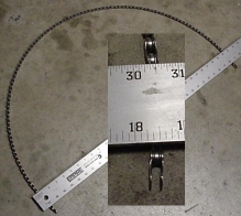 I measured the lateral stiffness of several chains by placing them on the garage floor with the axes of the pins level with the floor, then bending the chain to form an arc. Naturally, stiffer chains form a larger radius arc, and measuring this radius is one way to determine relative stiffness among chains. The radius is half the diameter. This chain's radius is about 15 inches.