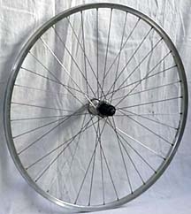 28. Rigida DP-18 12 spoke front, 650c. Built radially using DT 2.0 mm spokes and brass nipples on a Specialized sealed bearing hub. Spokes are in pairs 15 degrees apart. Thanks to Jane Rinard. | 793g | 18.2w x 29.6d mm | 1.75mm at pairs 1.83mm between |
