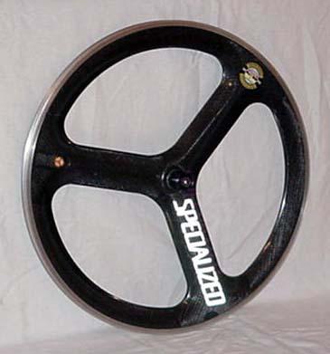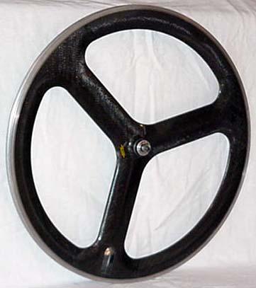 129. 2001 Nimble tri-spoke front. Molded using braided carbon fiber spokes and varibale depth rims. 940g with Tufo S3 Lite 215 tire. Thanks to Richard Wharton. | approx. 718g | 19w x 30 ~ 39d mm | 2.29mm at spokes; 4.45mm between |