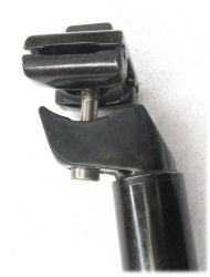 Single-bolt seatposts, also called Laprade seatposts, use a single vertical bolt to hold the saddle rails sandwiched between a pair of grooved blocks. The lower block will have a curved, serrated surface that mates with a matching curved, serrated surface that is part of the seatpost. When the bolt is loose, the blocks may be tilted to adjust the saddle tilt, and the rails can slide back and forth to adjust the front/rear position of the saddle.