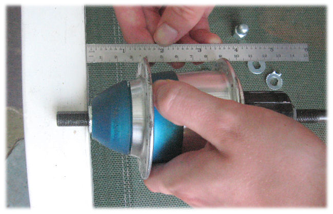 With unusual hubs, and especially with a large hub in a small rim, you must measure the flange spacing, or read dimensions from hub specifications. If both flanges are the same distance from the centerline, measure the spacing between the flanges and divide by two. If the two flanges are different distances from the centerline, measure them independently. Resting the locknut against the edge of a workbench or table makes measurement easier. An example is shown below, using the same hub.